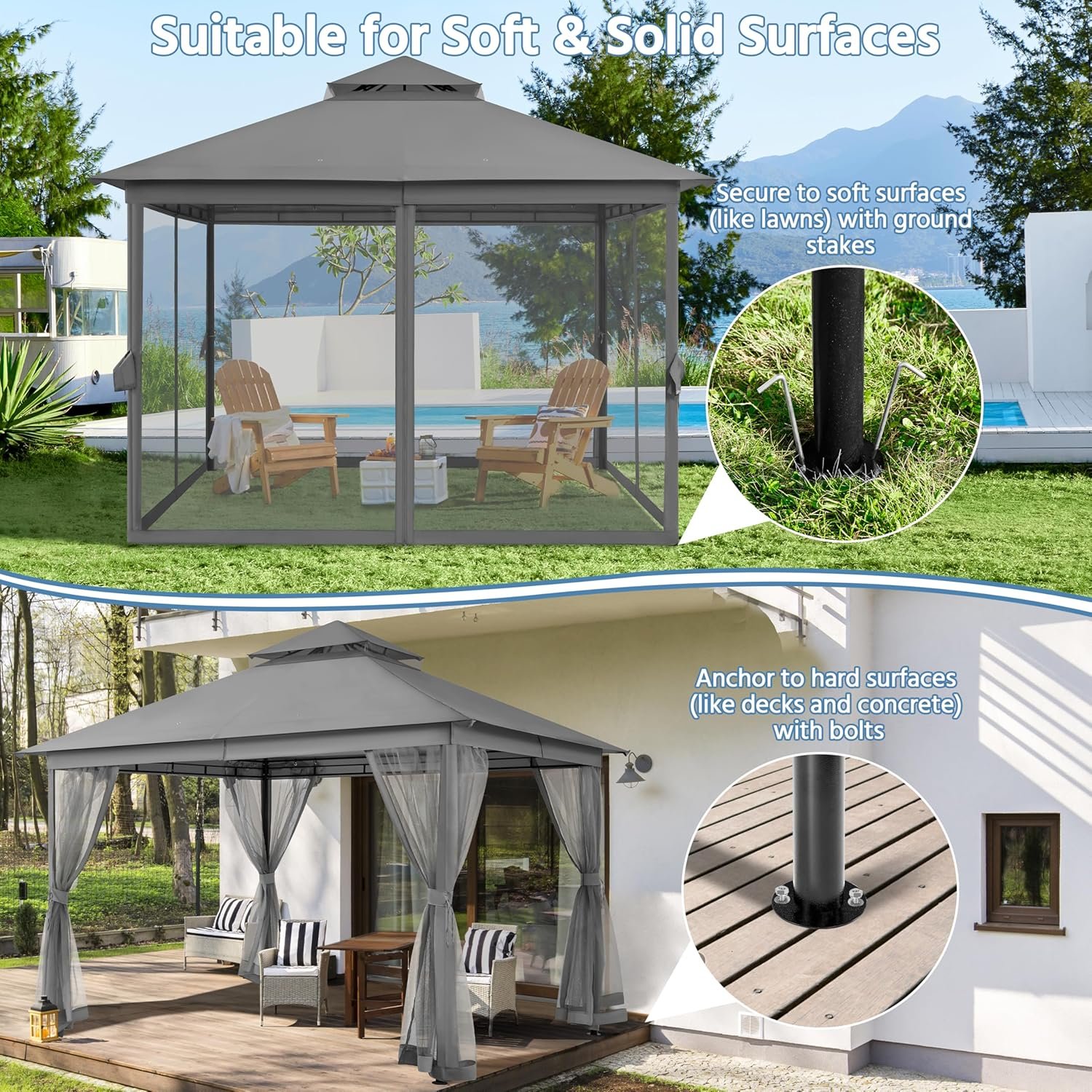 - Adaptable for Soft/Hard Surfaces: This gazebo includes two fitting types for different surfaces. Use 8 ground stakes for soft ground or 8 bolts to secure it on hard surfaces like concrete or wood
