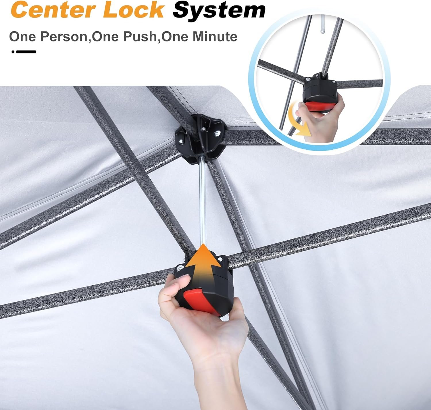 - EASY SET-UP GAZEBO: The latest ONE PUSH central lock technology design enables ONE PERSON to SET UP in ONE MINUTE by ONE BUTTON. This pop-up gazebo includes a convenient carry bag, making it an excellent portable and quick shade coverage solution during sports events, camping, trips, and backyard gatherings.